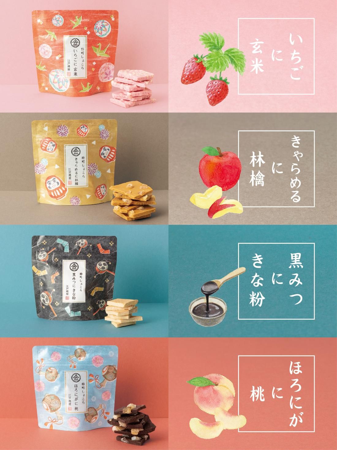 ・粋町しょこら4種(いちごに玄米、きゃらめるに林檎、黒みつにきな粉、ほろにがに桃)